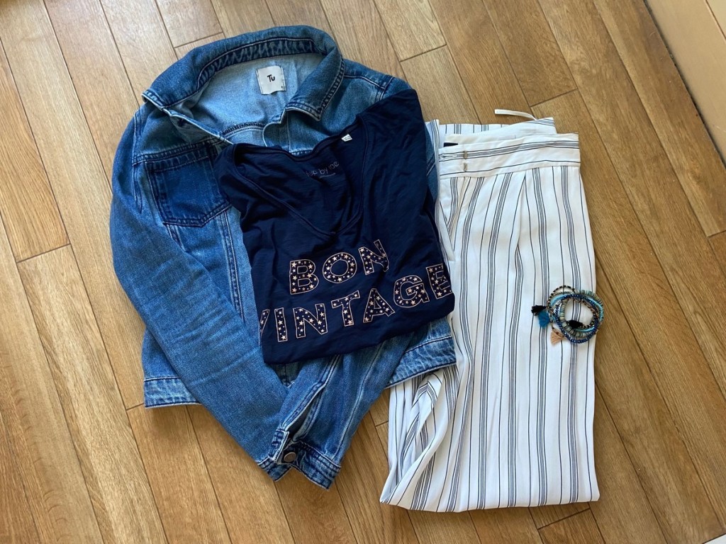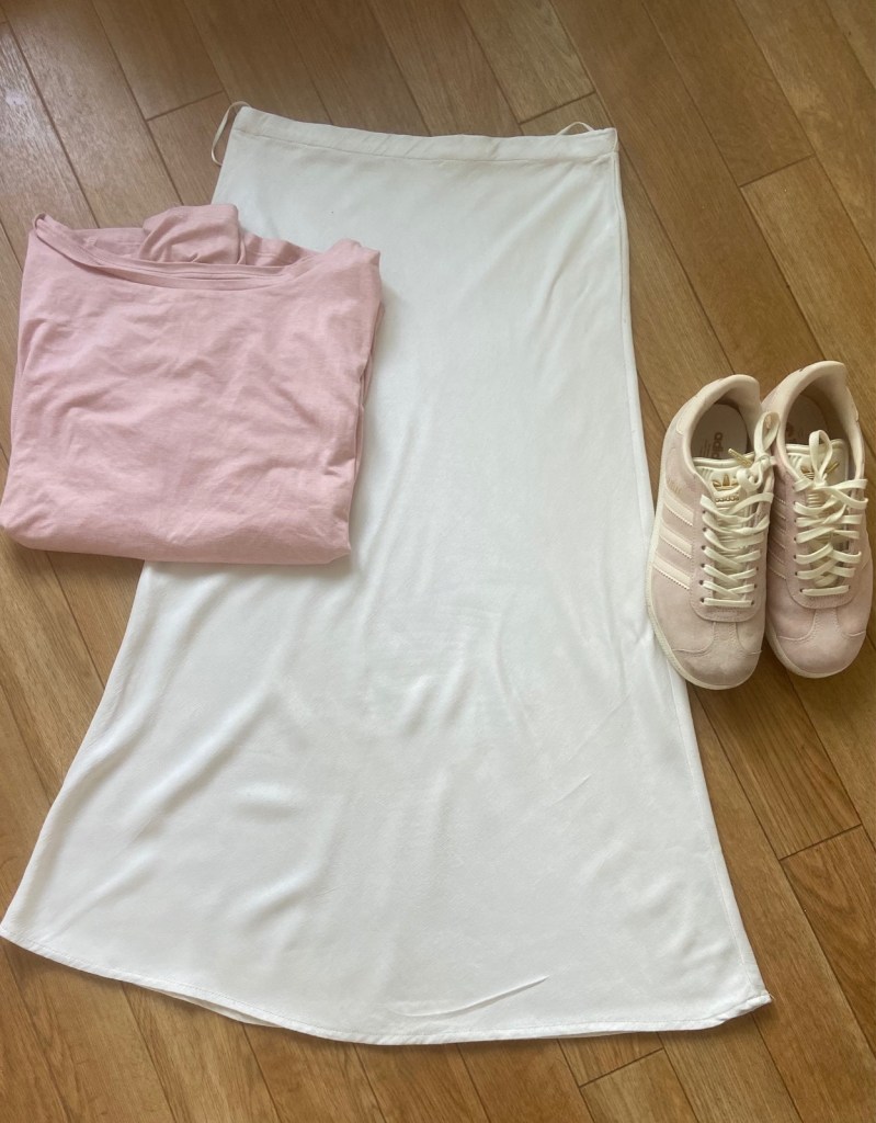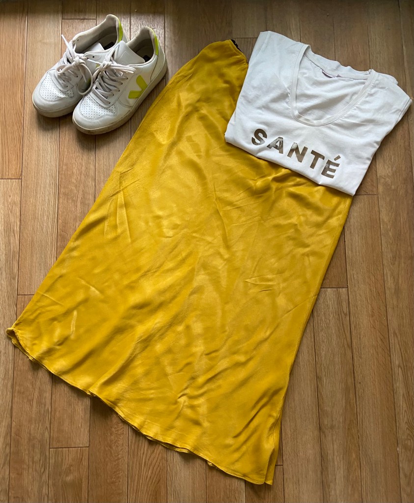 Main pic Hush Dress SS21. White skirt Zara SS19, Pink T Next SS19, Pink Adidas Gazelle SS21. Denim Jacket Sainsbury’s SS19, Striped Trousers Next SS18, Bon Vintage T FWP by Rae SS19, bracelets V&A SS21. Green dress Tesco SS20. Yellow Skirt Tesco SS19, Sante T FWP by Rae SS20, Veja SS20. God I buy a lot of clothes from supermarkets.